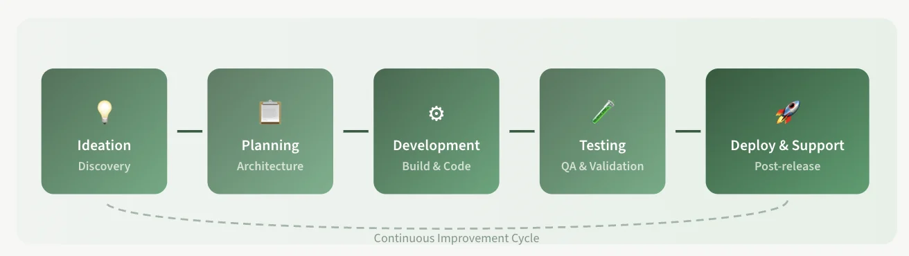 The five core phases of the software development lifecycle, connected by a continuous improvement cycle